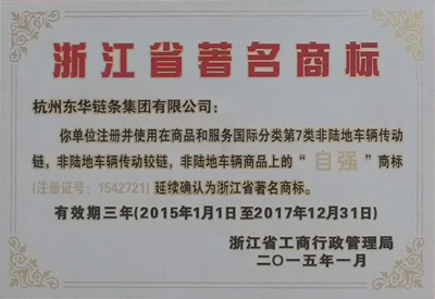 日前,由浙江省工商行政管理局認定,我公司注冊并使用在商品和服務國際分類第7類非陸地車輛傳動鏈,非陸地車輛傳動鉸鏈,非陸地車輛商品上的“自強”商標延續確認為浙江省著名商標。有效期為201511日至20171231日。