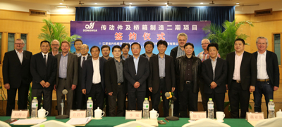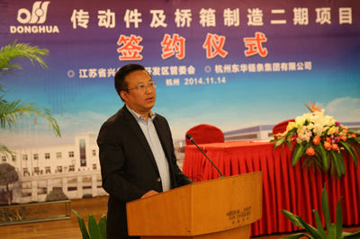 簽約儀式上,董事長宣碧華致辭。他說,東華2007年收購興化齒輪廠,至今已有8年,一直得到了興化市委、市政府和興化開發(fā)區(qū)的大力支持,使一個當(dāng)時不太景氣的企業(yè),得到了新生、發(fā)展?,F(xiàn)在不僅是鏈條行業(yè),齒輪、鏈輪、變速箱、橋箱將同步發(fā)展。今天簽約的興化這個項(xiàng)目,我們考慮了東華發(fā)展的增量和存量。增量是我們希望到2020年生產(chǎn)總量翻一番,興化的這個土地就是我們的增量空間。存量有兩塊,一是原來我們在外采購的原材料、零部件,拿回來放在興化生產(chǎn),保證質(zhì)量;二是現(xiàn)在臨平三廠區(qū)制造鏈條要退二進(jìn)三,騰籠換鳥,把騰出來的廠房做新的項(xiàng)目,比如傳動件超市、輸送機(jī)械、CVT變速箱,所以今天我們在這兒舉行簽約儀式,對東華來講是一個很好的發(fā)展機(jī)會,具有里程碑意義。