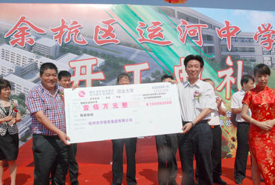7月3日,烈日炎炎,在運河中學舉行的開工典禮上,東華集團董事長宣碧華熱心參與余杭區運河鎮組織的“捐資助?!すΦ虑铩贝壬凭栀浕顒樱蜻\河中學建校捐款100萬元,為“運河中學”建設項目添磚加瓦,充分體現了東華集團關心、支持教育事業的拳拳愛心。