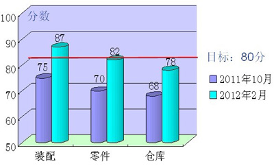 樣板先行,整體推進  事業部從實際出發,確立“樣板先行、整體推進”方針,做到以點帶面、全面推進、激勵到位。在推行5S、TPS 活動的第一階段,我們確定了專機班為樣板,之后擴大到總成班、倉庫等,通過樣板區域的改善實例,教育引導事業部其它班組和區域的改善。樣板的建立一方面塑造了一個學習參照的對象,另一方面也激發了學、趕、超的氛圍,有效促進了整個事業部5S、TPS 改進活動熱情的提升。