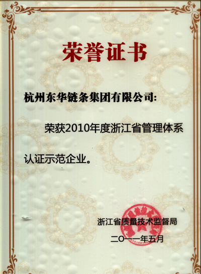 通過對質量管理體系的認證,規范了企業的管理,取得了一定的成果,此次被浙江省技術監督局授予“2010年度浙江省管理體系認證示范企業”稱號,充分說明企業在質量管理方面取得的成果,并得到了省級機關的認可。