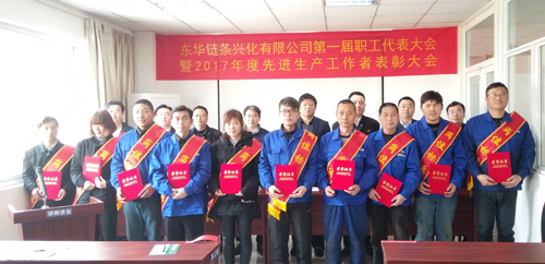 3月22日,在雄壯的國歌聲中,東華鏈條興化公司隆重召開第一屆職工(工會)代表大會暨2017年度先進表彰大會。集團副總經理袁立華、公司法定代表蔣錫林、公司工會主席汪昌宏、公司副總經理邱德方、劉冬根、傳動鏈事業部總經理楊小勇及其他中層、各分工會主席、各崗位標兵、先進代表、職工(工會)代表等60余人參加大會。