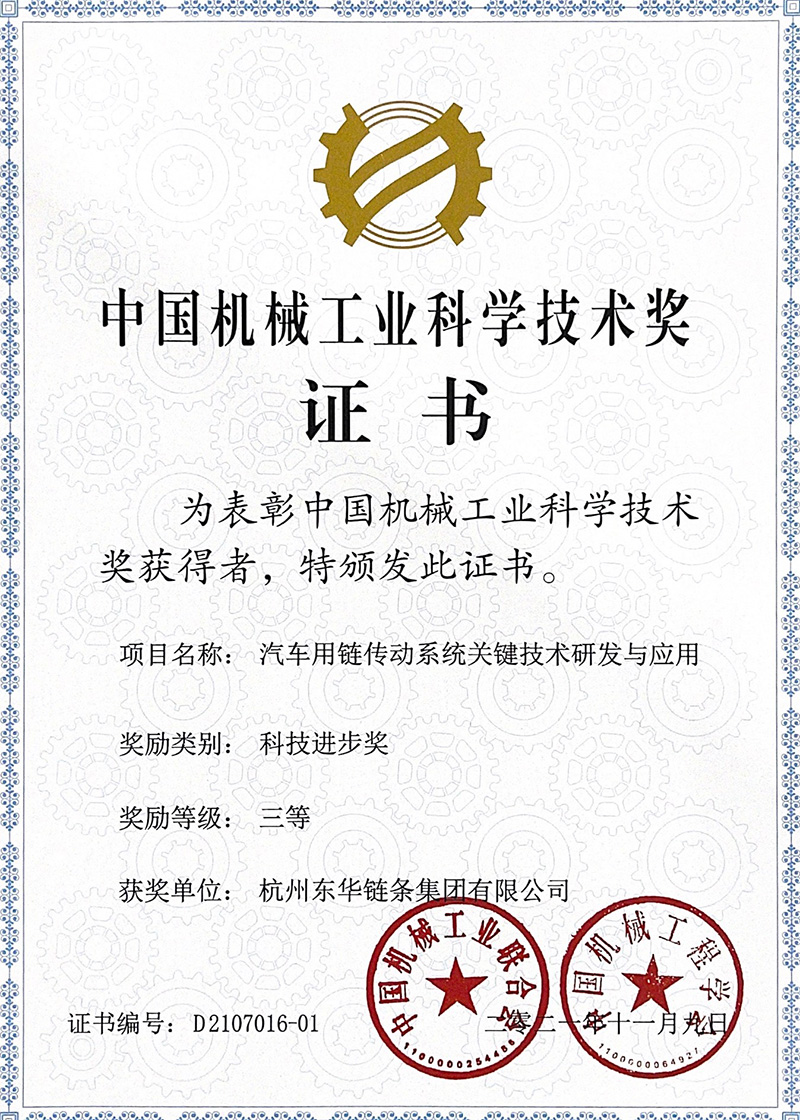 日前,東華為主承擔、武漢某公司參與研發(fā)的“汽車用鏈傳動系統(tǒng)關(guān)鍵技術(shù)研發(fā)及應(yīng)用”高端鏈傳動系統(tǒng)研發(fā)項目獲2021年度中國機械工業(yè)科學技術(shù)獎科技進步獎三等獎,東華是全國鏈傳動行業(yè)中唯一獲得2021年度中國機械工業(yè)科技大獎的企業(yè)。