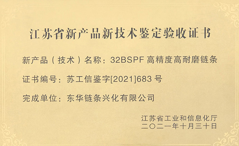 日前, 東華鏈條興化公司收到江蘇省工業(yè)和信息化廳頒發(fā)的江蘇省省級(jí)工業(yè)新產(chǎn)品新技術(shù)驗(yàn)收證書(shū),公司研制的“32BSPF高精度高耐磨鏈條”產(chǎn)品通過(guò)省級(jí)工業(yè)新產(chǎn)品鑒定。