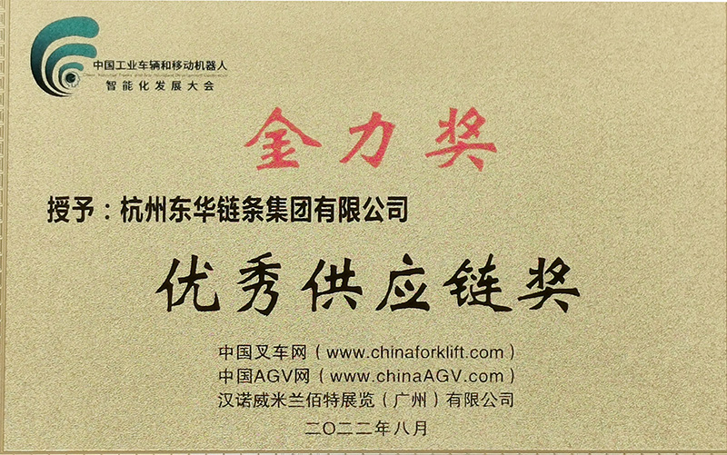 8月24日,由中國叉車網、中國AGV網、漢諾威米蘭佰特展覽(廣州)有限公司聯合主辦的“2022中國工業車輛和移動機器人智能化發展大會暨頒獎盛典”在廣州市中國進出口商品交易會展館舉行。東華被大會授予“金力獎-優秀供應鏈獎”,是獲獎的唯一一家鏈條企業。