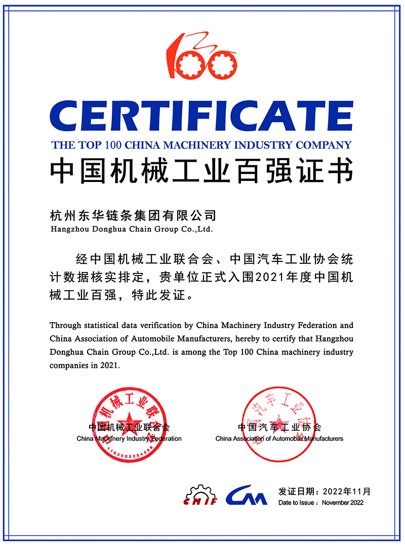 2022年,東華鏈條集團榮登中國機械工業(yè)百強榜第60位,這是東華鏈條集團連續(xù)七年榮登中國機械工業(yè)百強榜,也是中國鏈傳動行業(yè)唯一上榜企業(yè),充分展現(xiàn)出企業(yè)在中國鏈傳動行業(yè)的綜合實力和龍頭地位。
