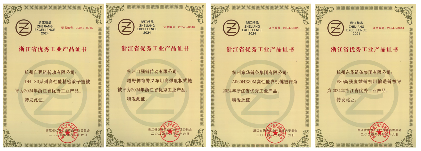 日前,浙江省優(yōu)秀工業(yè)產(chǎn)品評選委員會發(fā)布了“2024年浙江省優(yōu)秀工業(yè)產(chǎn)品”,東華四項(xiàng)高端產(chǎn)品榮獲“浙江省優(yōu)秀工業(yè)產(chǎn)品”稱號。分別是“DH-X3系列高性能精密滾子鏈”、“越野伸縮臂叉車用高強(qiáng)度板式鏈”、“A960HK39M高性能農(nóng)機(jī)鏈”、“P80高強(qiáng)度攤鋪機(jī)用輸送鏈”。