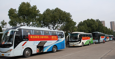 1月25日中午,公司南廠區大門外分外熱鬧,9部掛著祝福員工一路平安、新年快樂橫幅的大巴車一字排列,等待著送300余名員工回家過春節,濃濃的節日氛圍掛在每個員工的臉上。